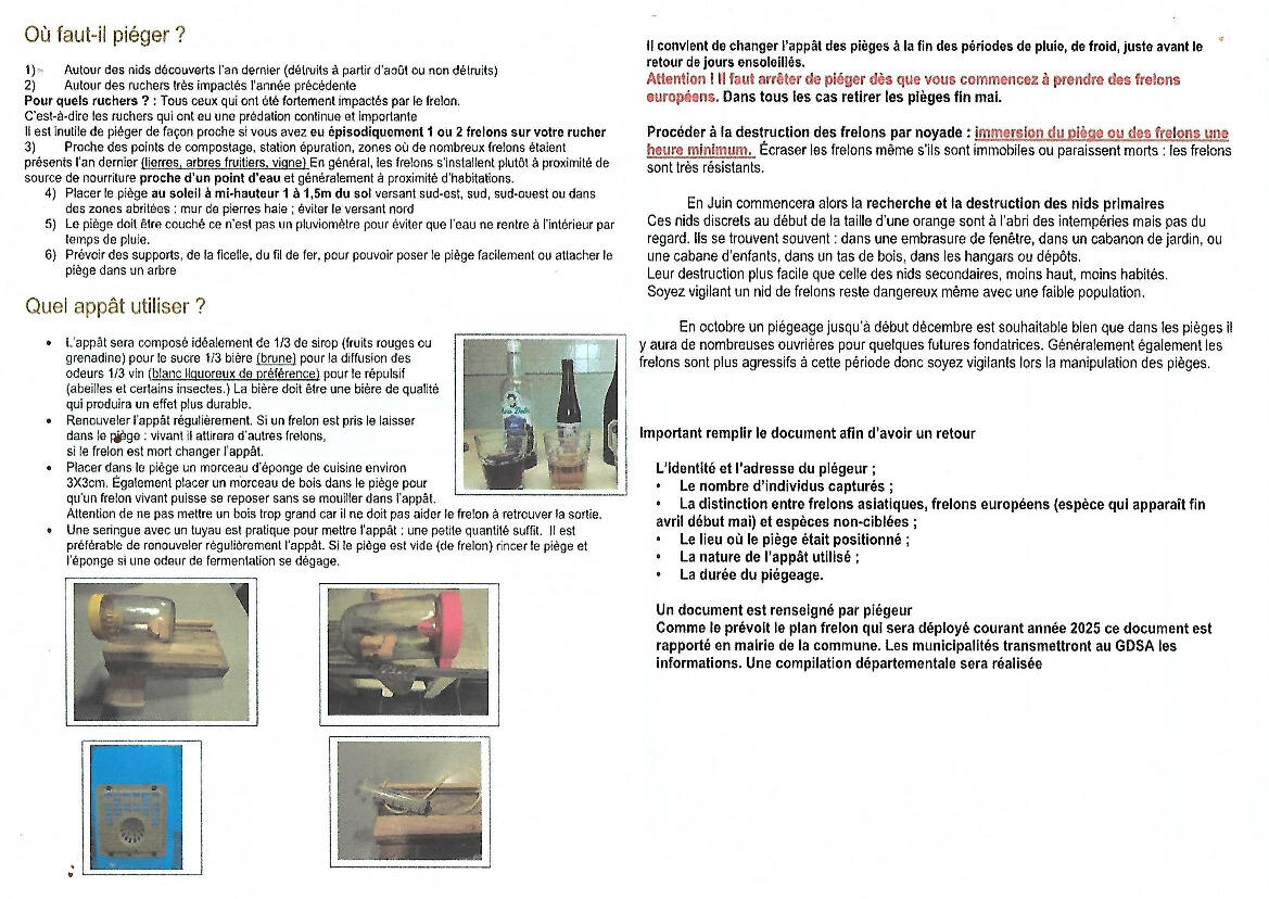 Le vendredi 13 mars à 18H, la municipalité organise une DISTRIBUTION GRATUITE de pièges à frelons pour toutes les personnes concernées par ce problème. Cette distribution sera précédée d'une réunion d'information afin d'optimiser le rendement de ce dispositif. Vous trouverez en pièce jointe quelques informations utiles. RDV salle polyvalente.