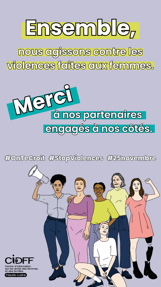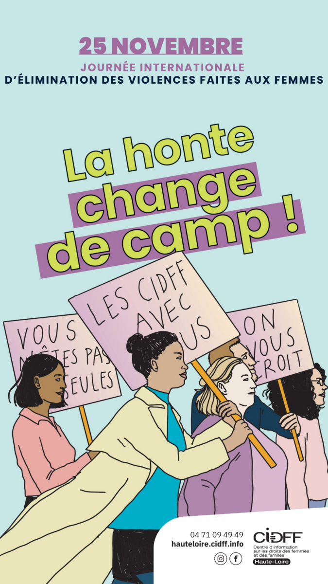 Le CIDFF Haute-Loire (Centre d’Information sur les Droits des Femmes et des Familles) ainsi que nous même, s’associons à la Journée internationale pour l’élimination des violences faites aux femmes, le 25 novembre.