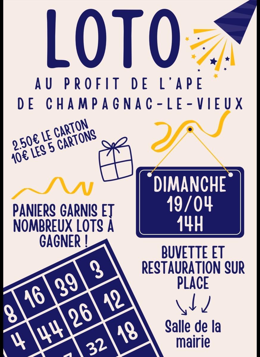 Loto De L'ape Ce Dimanche ! 18/04/2026 Venez nombreux au loto proposé par l'APE, association des parents d'élèves, de l'école de Champagnac-le-Vieux ! Nombreux lots à gagner et grand moment de convivialité ! Informations et tarifs sur l'image.