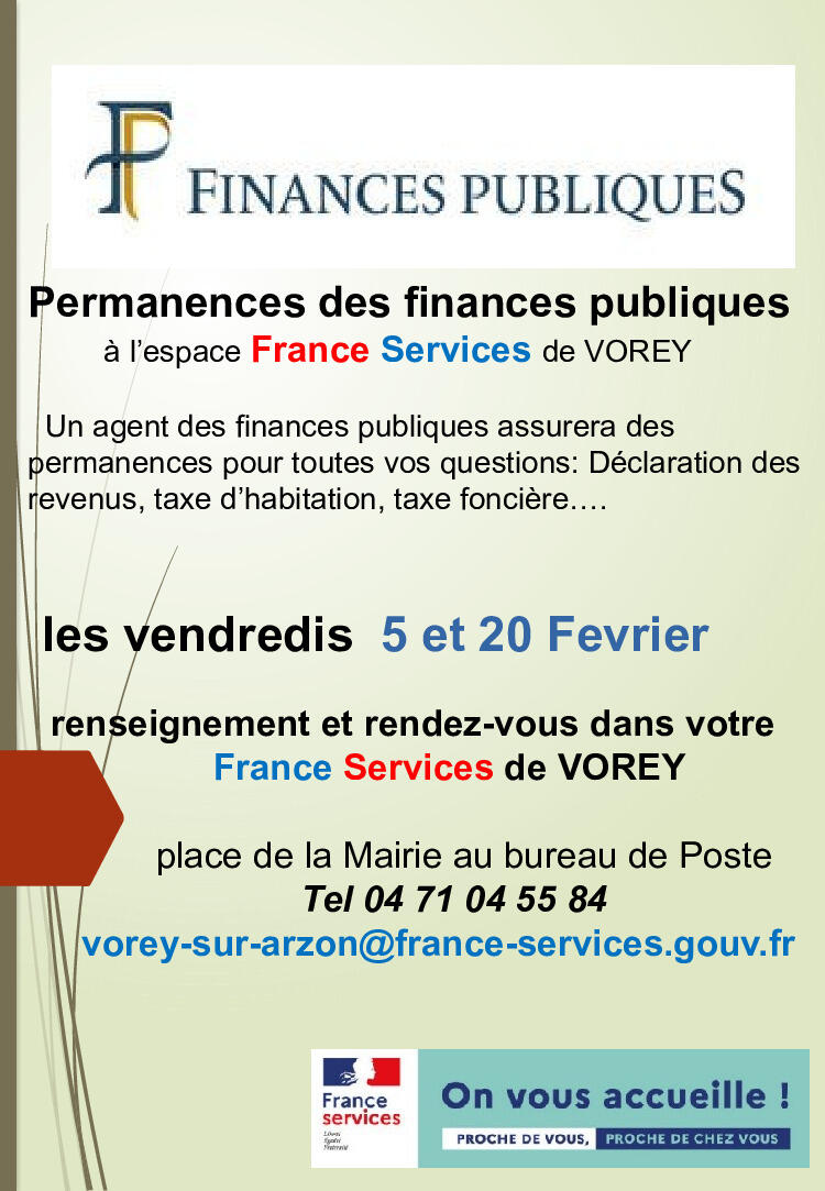 Les prochaines permanences des Finances Publiques se dérouleront les Vendredis 5 février et 20 février 2026.