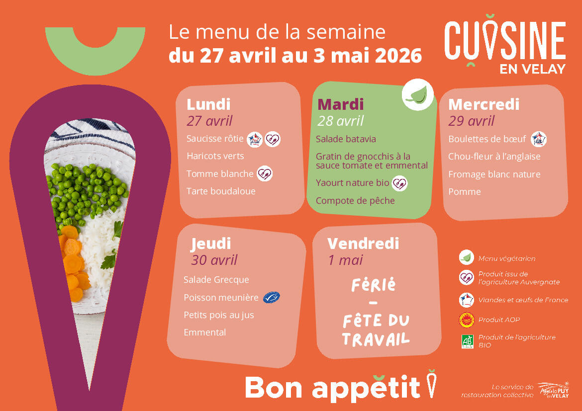 MENUS CANTINE DU 27 AVRIL AU 01 MAI 21/04/2026 Pensez à réserver les menus cantine avant le jeudi 23 avril 12h00