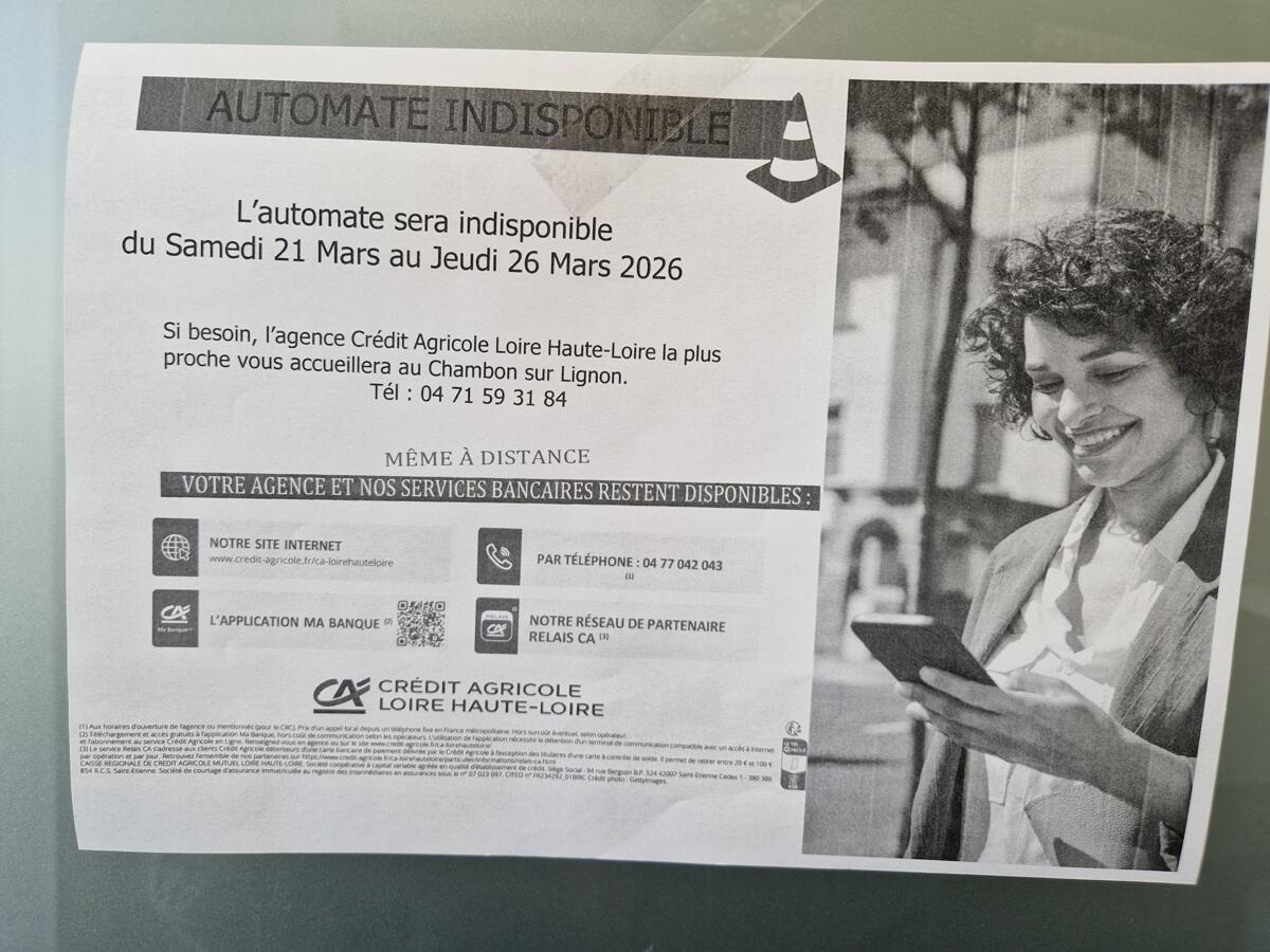 Indisponibilité de l automat Credit Agricole 20/03/2026 Du 21/03 au 26/3 Voir affiche Source : Mairie de Fay-sur-Lignon