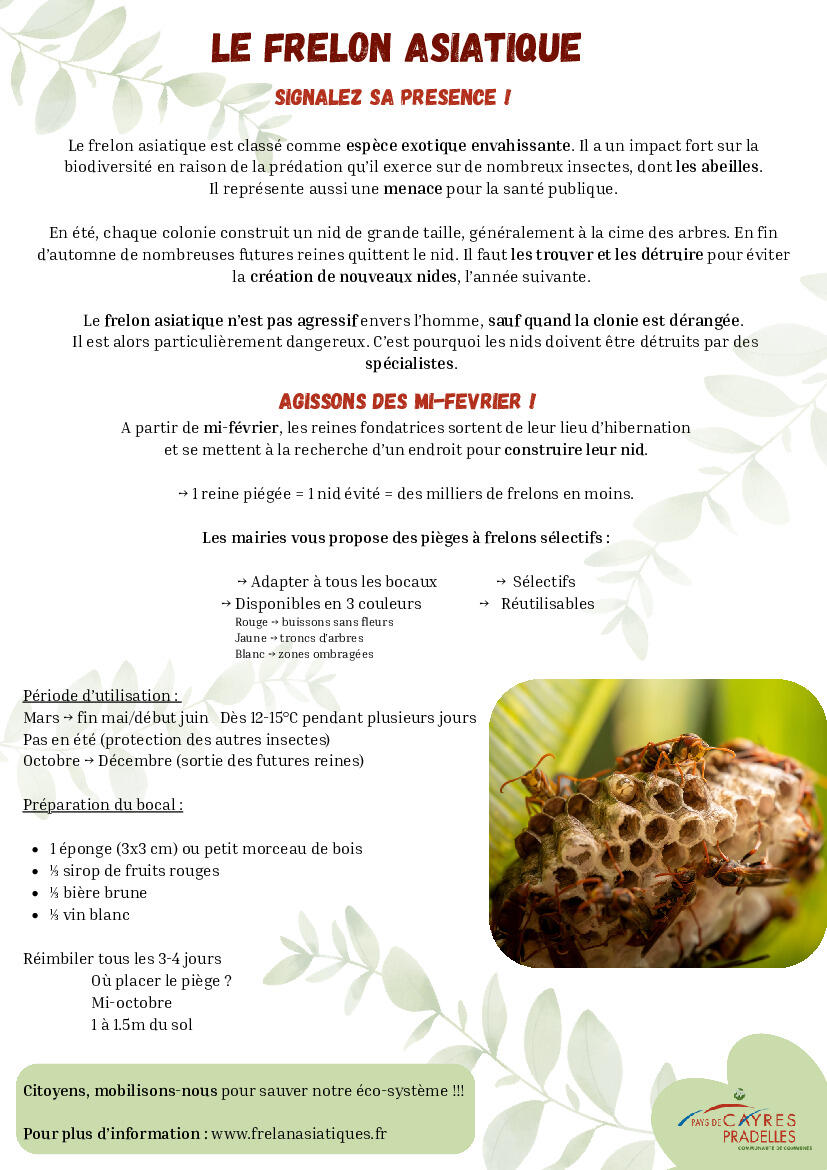 Si vous avez repéré des frelons dans la commune (sur vos propriétés ou sur la voie publique), merci de le signaler en mairie car Il est important de détruire les reines avant la construction des nids.