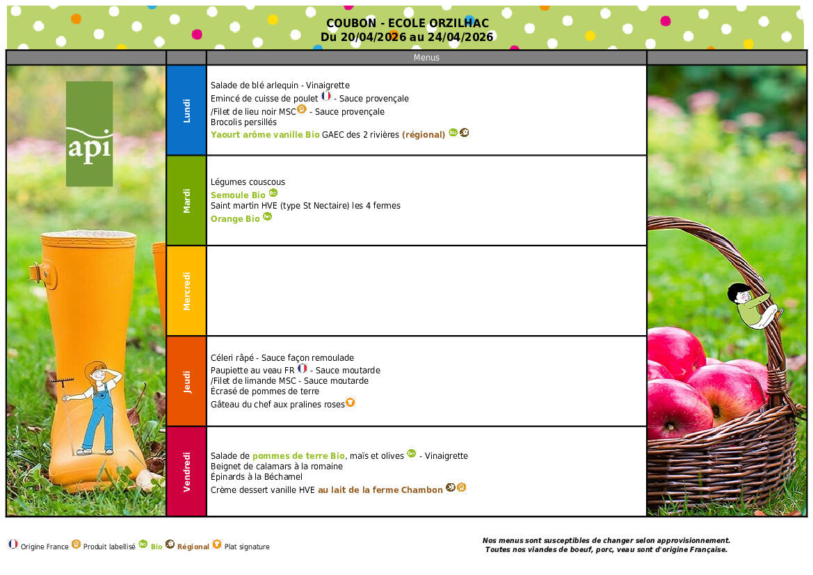 Menu cantine du 20 au 24 avril 2026