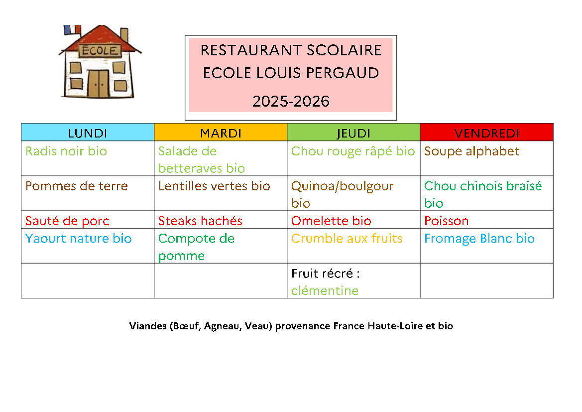 🍽 Menu du restaurant scolaire 20/11/2025 Menu du 24 au 28 novembre inscription avant ce soir minuit Source : Mairie de Cussac-sur-Loire