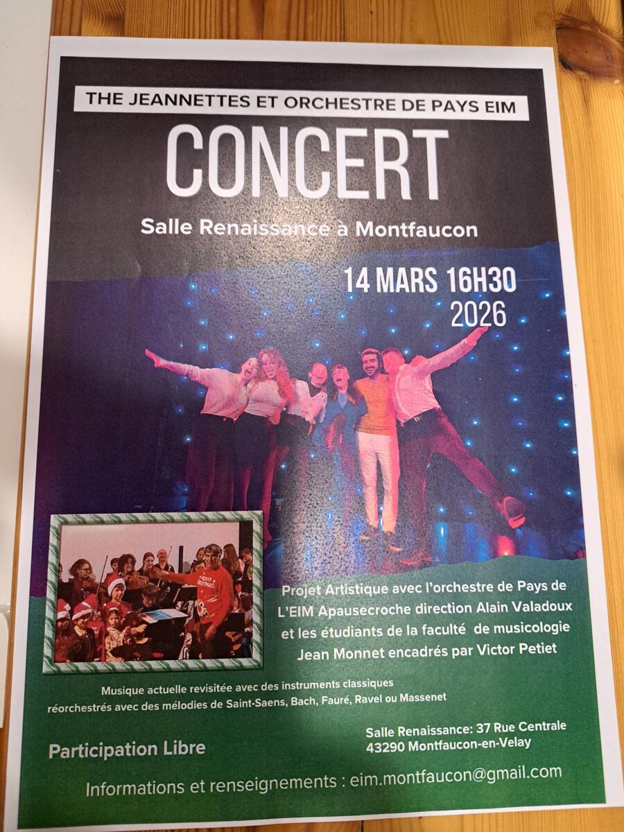 Concert De L'école De Musique 12/03/2026 Samedi 14 mars a 16h30 organisé par Apausecroche "The Jannettes et orchestre de pays" , salle de la renaissance à Montfaucon. participation libre.