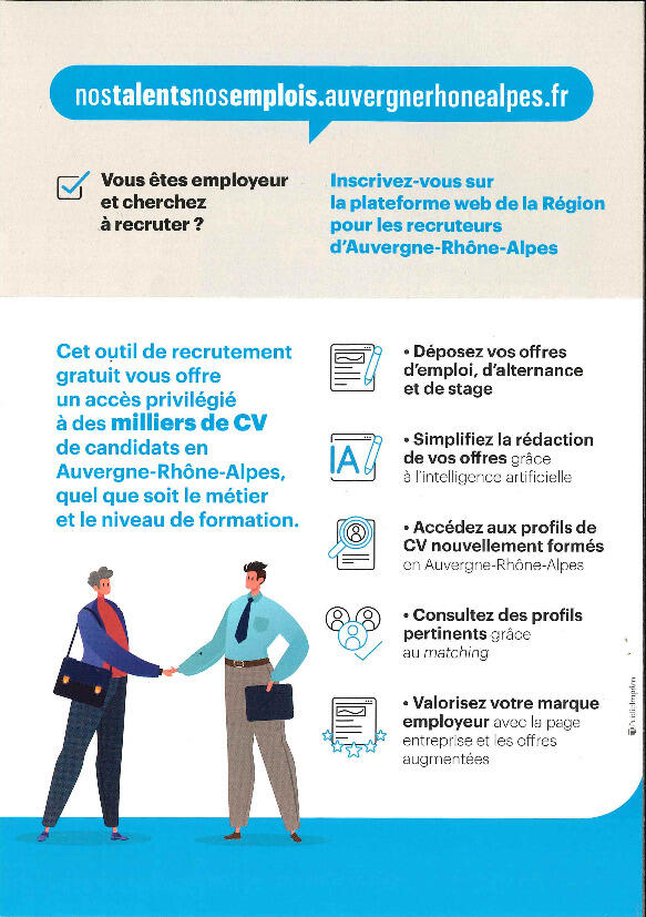 La Région Auvergne – Rhône-Alpes a mis en place depuis plusieurs années la plateforme « Nos Talents, nos Emplois » : https://nostalentsnosemplois.auvergnerhonealpes.fr/