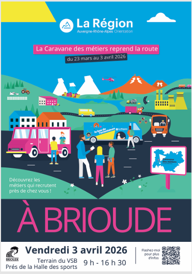 Du 23 mars au 3 avril 2026, la Caravane des métiers va sillonner les territoires d’Auvergne-Rhône-Alpes. Cette 5ᵉ édition, organisée par Auvergne-Rhône-Alpes Orientation et ses partenaires, offre une formidable occasion de découvrir de nombreux secteurs d’activités et métiers qui recrutent et de s’informer sur les opportunités d’orientation scolaire et professionnelle. Pour la première fois, elle fera étape à Brioude le vendredi 3 avril 2026, sur le terrain du VSB, près de la Halle des sports.