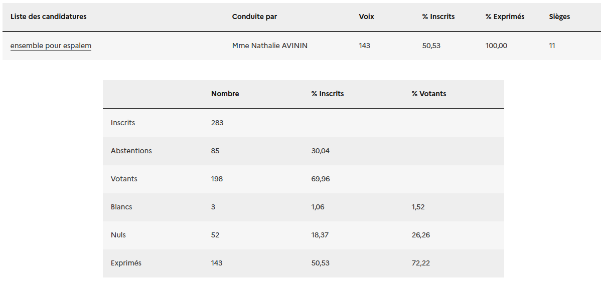 Pas de deuxième tour dimanche prochain, la liste "Ensemble pour Espalem" est élue entièrement et les 11 sièges sont pourvus.