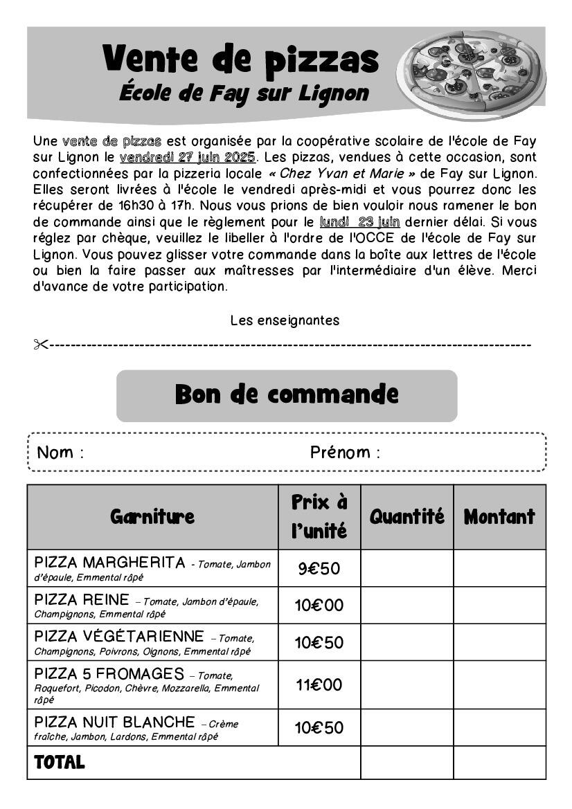 Opération pizza pour l ecole 26/05/2025 Commande des pizzas au bénéfice de l école. Dernière délai 23/06,livraison 27/06 Voir affiche