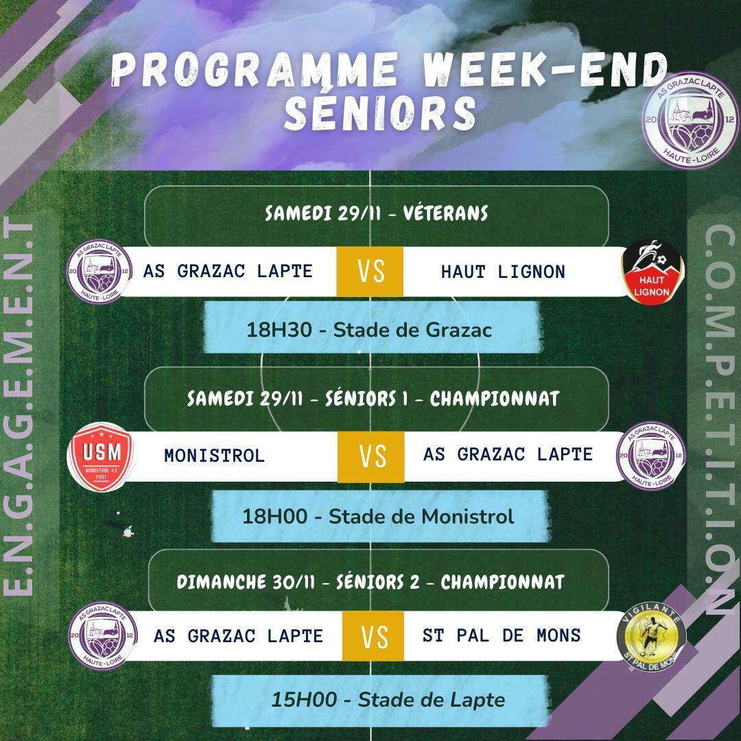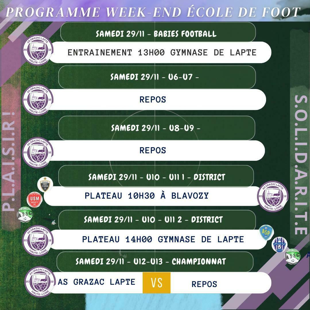 ASGL: Agenda Foot du week-end.⚽️🟣⚫️ 29/11/2025 ⚽️🟣⚫️ Programme week end Football ⚽️🟣⚫️ #TeamASGL Source : Mairie de Grazac