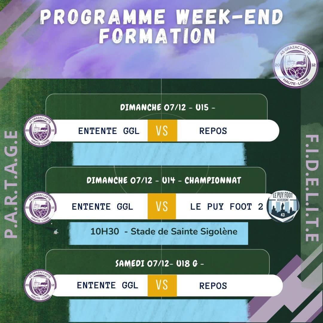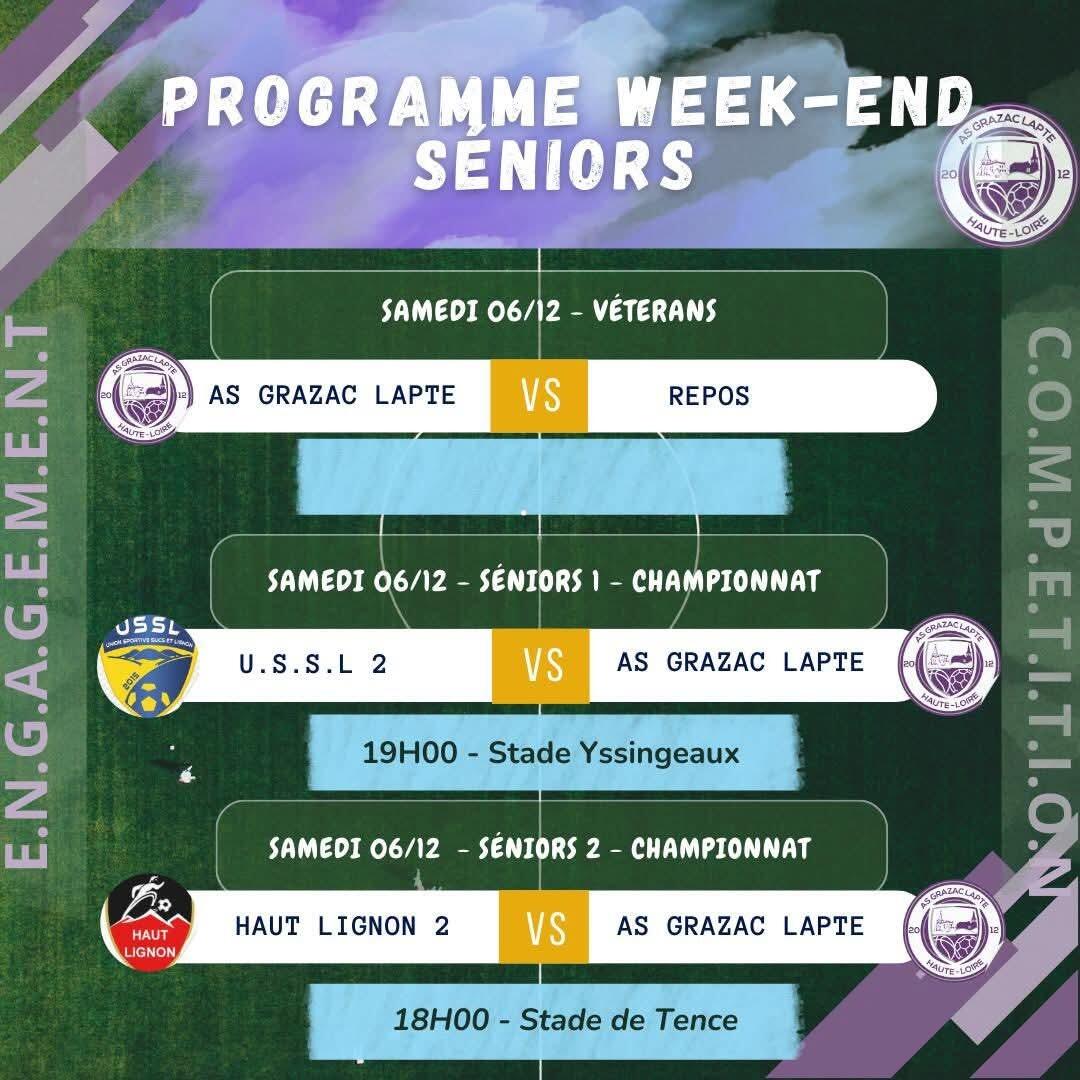 ASGL: Agenda Foot du week-end.⚽️🟣⚫️ 05/12/2025 ⚽️🟣⚫️ Programme week end Football ⚽️🟣⚫️ #TeamASGL Source : Mairie de Grazac