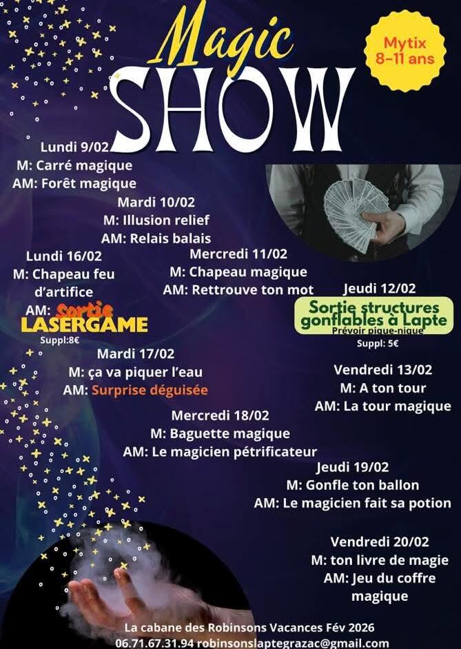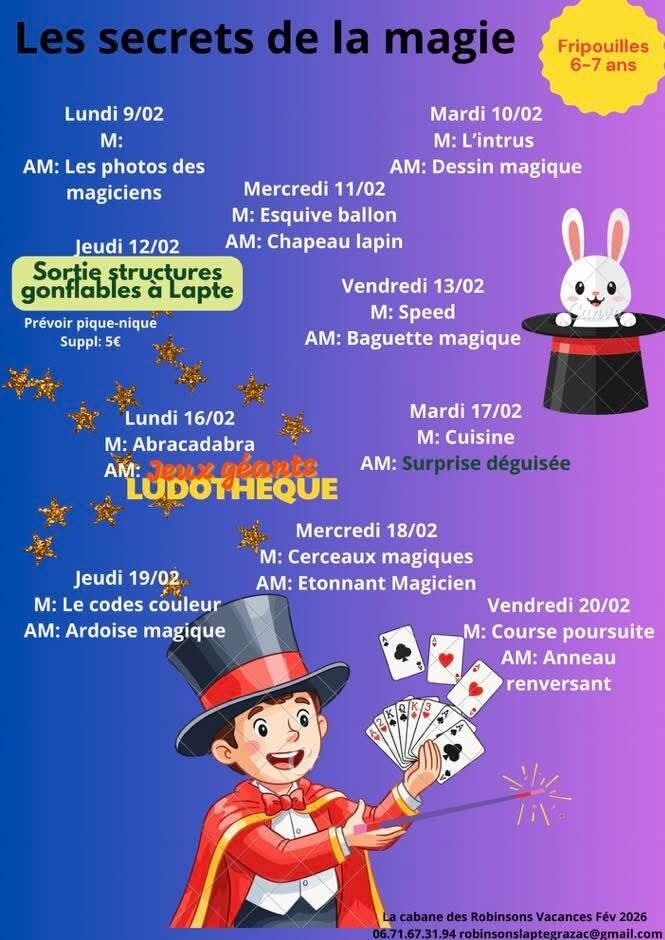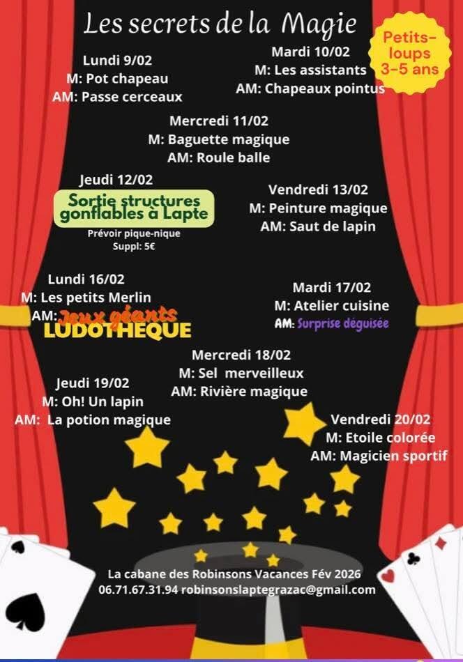 Cabane des robinsons: programme des Vacances de Février. 27/01/2026 Bonnes vacances d'hiver à tous ! 😉