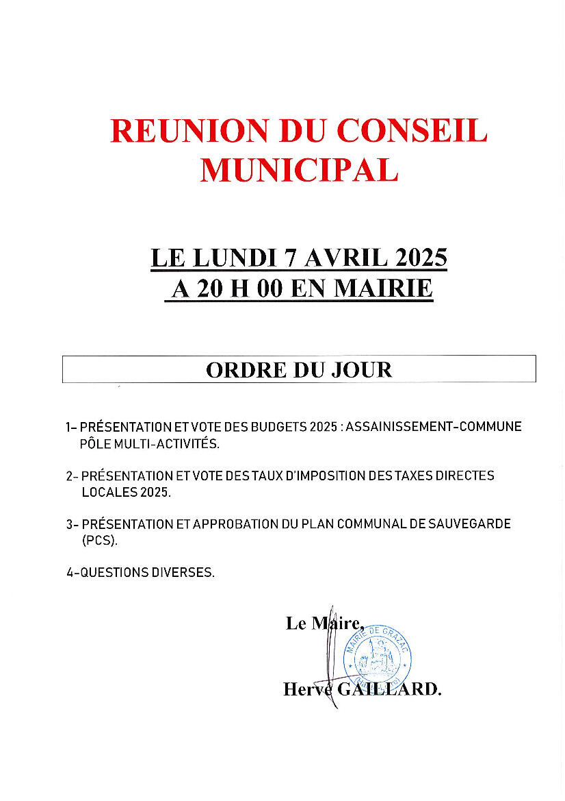 Le conseil municipal aura lieu le Lundi 07 Avril 2025 à 20h en Mairie de Grazac.