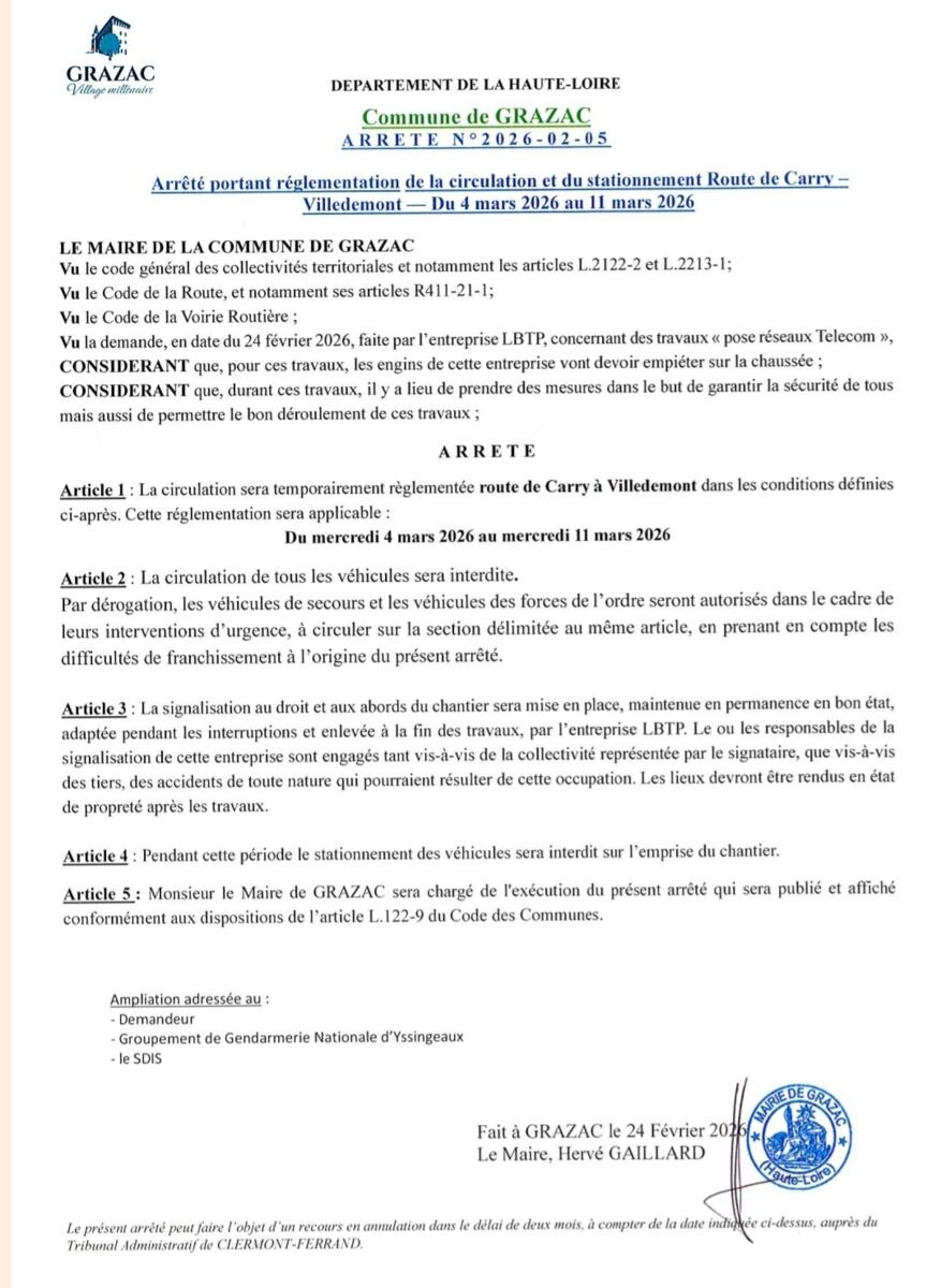 Mairie De Grazac: Arrêté Municipal De Circulation. 25/02/2026 Veuillez trouver ci joint un arrêté de circulation pour la pose de réseau Télécom Route de Carry à Villedemont. Merci de votre compréhension.