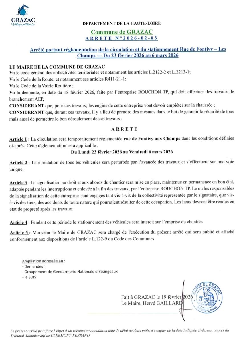 Village Des Champs : Arrêté Circulation. 21/02/2026 En raison de travaux au village des Champs, la circulation sera perturbée par l'entreprise ROUCHON. Vous trouverez ci-joint un arrêté de circulation du lundi 23 Février au vendredi 06 Mars dans la Rue de Fontivy . Merci de votre compréhension.