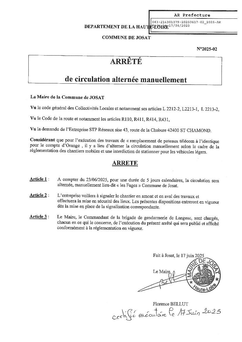 ARRETE DE CIRCLUATION ALTERNEE MANUELLEMENT 17/06/2025 LIEU.-DIT LES FAGES du 23 juin 2025 au 27 juin 2025