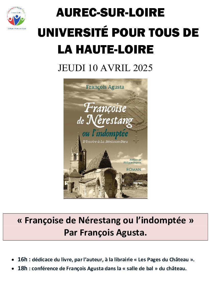 Jeudi 10 avril – après-midi autour du livre « Françoise de Nérestang ou l'indomptée - D'Issoire à La Bénisson-Dieu », roman de François Agusta.