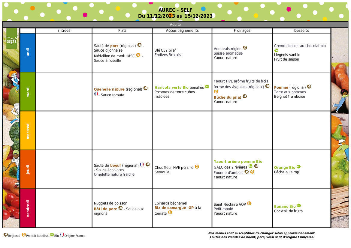 Menus du 1er décembre 2025 au 05 décembre 2025