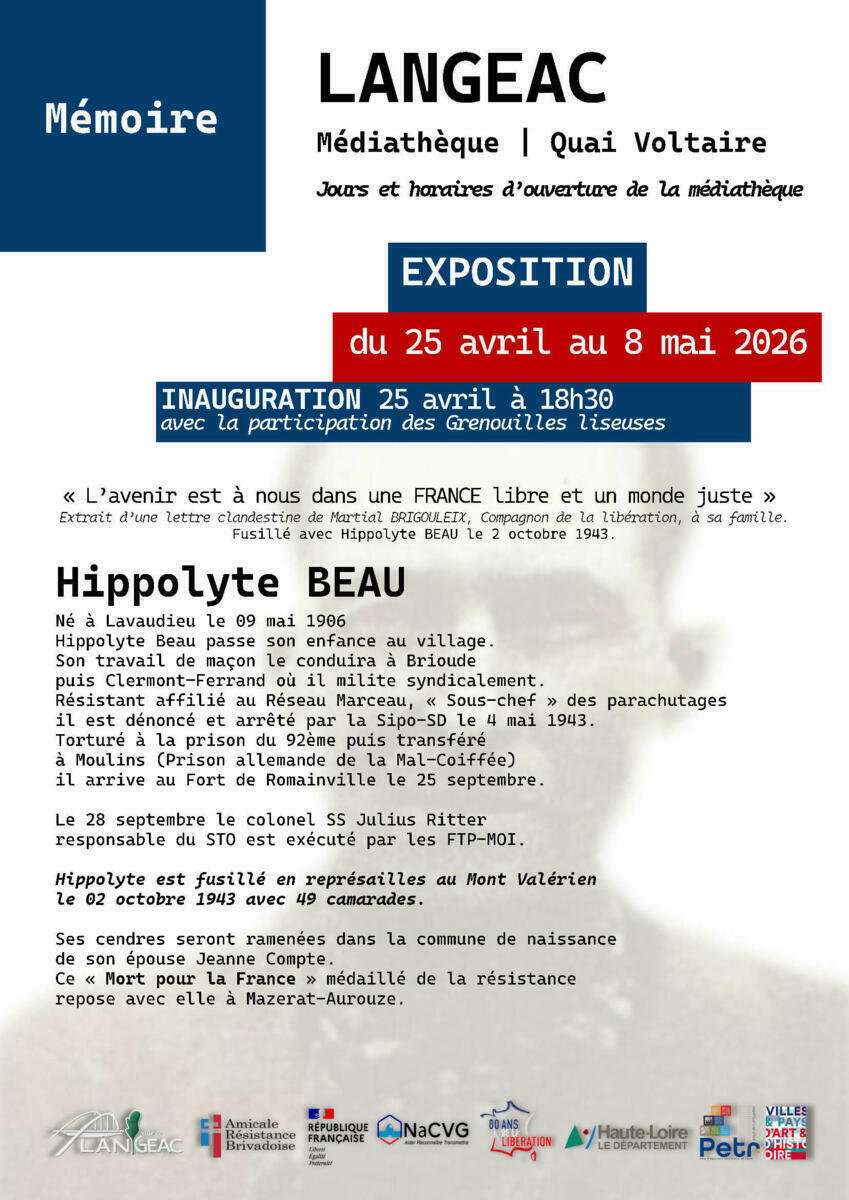 Du Samedi 25 avril au 8 mai 2026, nous vous invitons à découvrir une exposition poignante consacrée à 𝐇𝐢𝐩𝐩𝐨𝐥𝐲𝐭𝐞 𝐁𝐞𝐚𝐮, dans la salle d'exposition située au rez-de-chaussée de la Médiathèque.