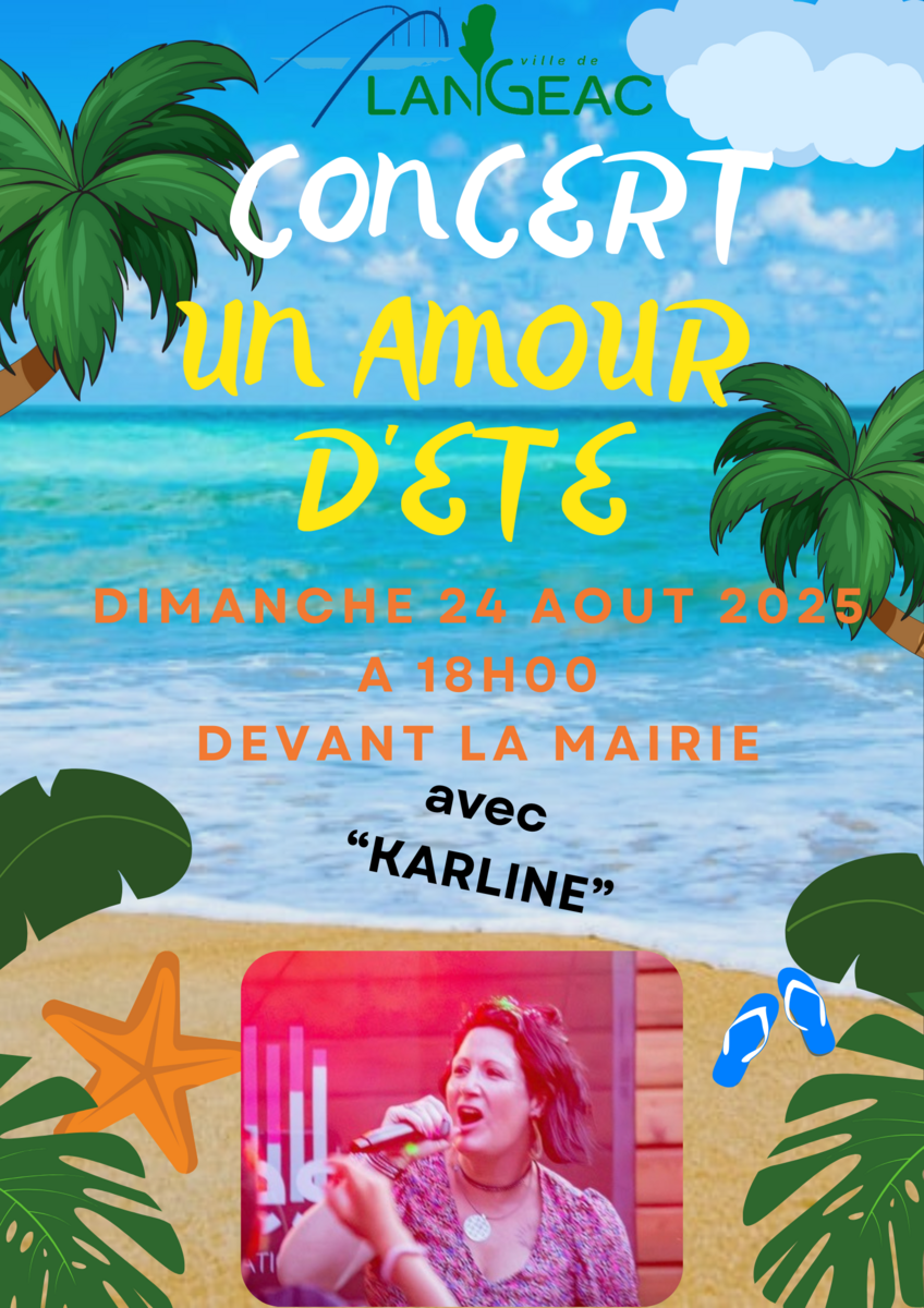 UN AMOUR D'ETE 18/08/2025 Concert devant la mairie, dimanche 24 août, à 18h, avec "Karline". Concert gratuit et ouvert à tous !