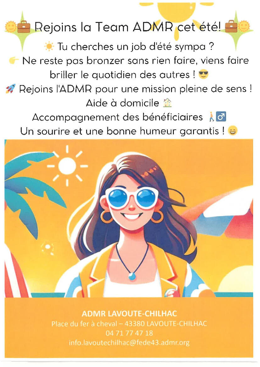 ADMR Lavoûte-Chilhac 24/07/2025 Vous recherchez un job d'été ? N'hésitez pas, venez rejoindre la Team ADMR.