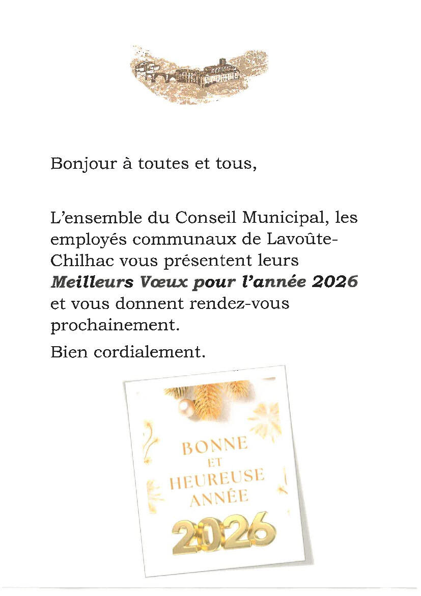 Vœux 2026 Du Conseil Municipal Et Des Employés Communaux 30/12/2025 Les Membres du Conseil Municipal de Lavoûte-Chilhac et les employés communaux vous adressent leurs Meilleurs Voeux pour cette nouvelle année.