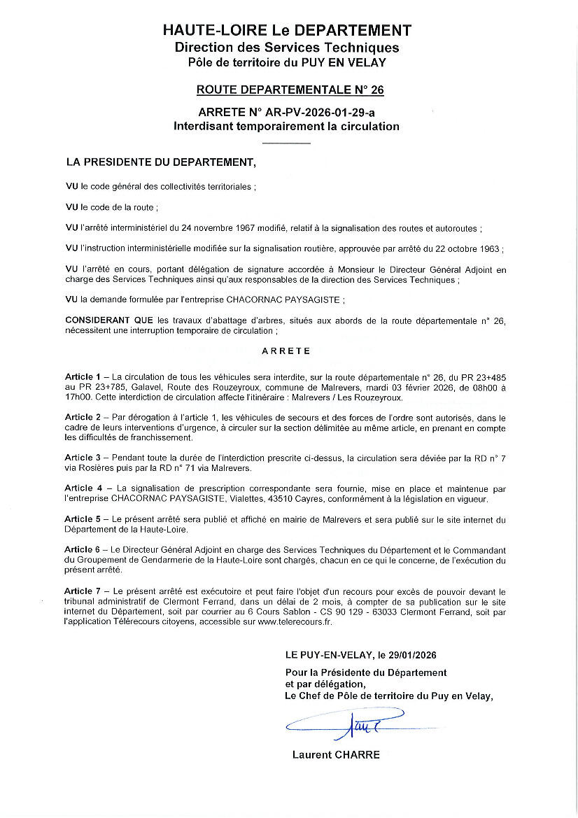 Voir l'arrêté du Conseil Départemental en pièce jointe