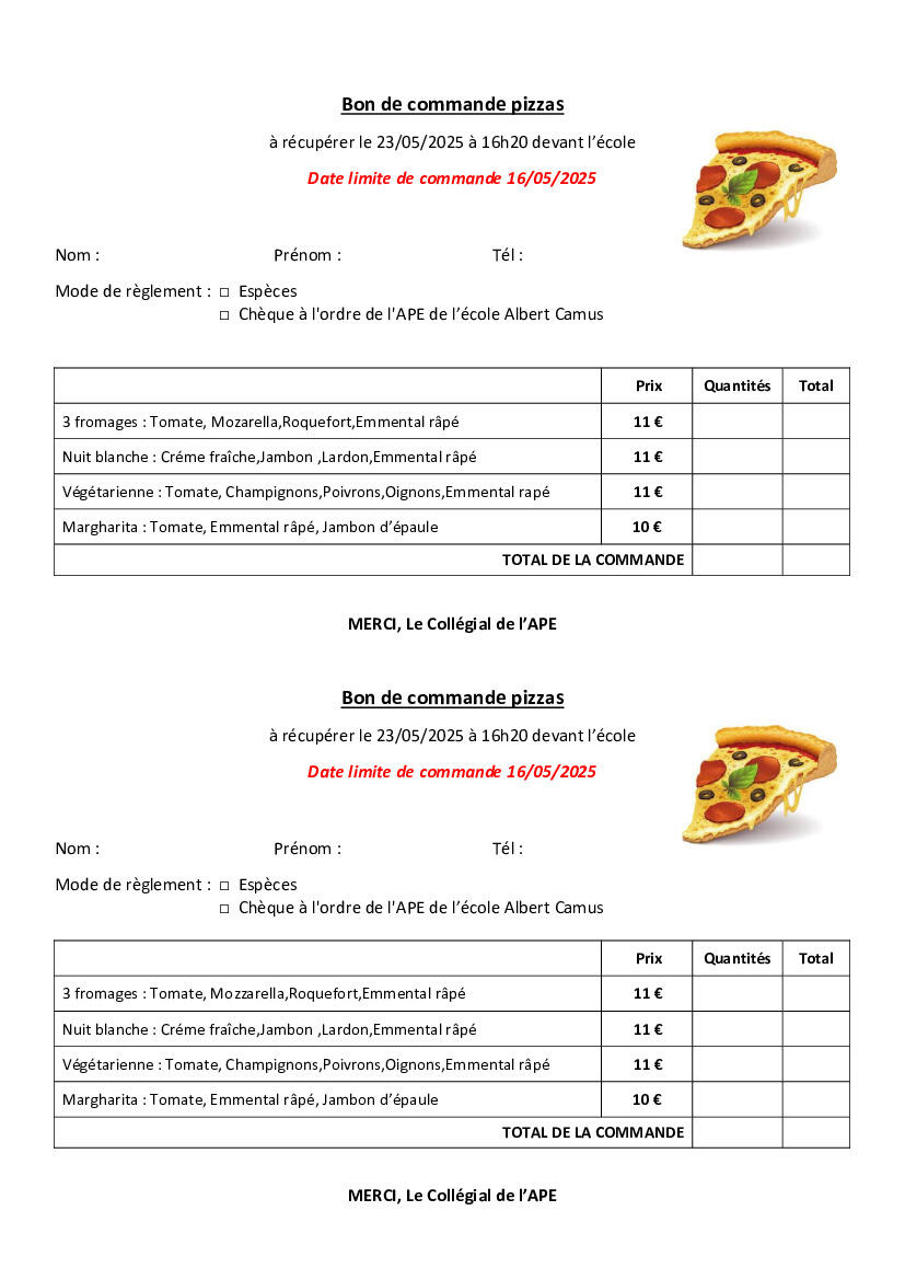 Ecole du Mazet, l'APE organise son opération pizzas en mai 13/04/2025 Ci joint bon de commande et affiche