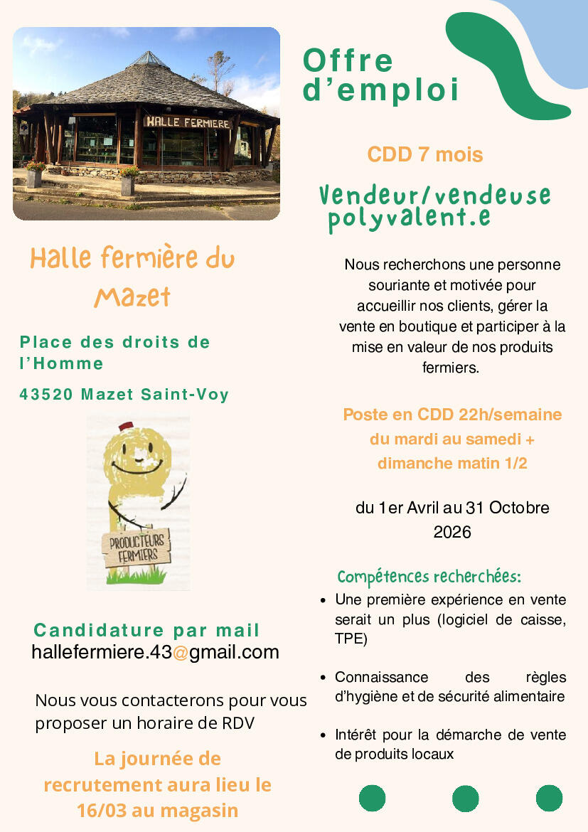 Offre d'emploi au Mazet, à la Halle Fermière 11/03/2026 Offre d'emploi à la Halle Fermière du Mazet St Voy.