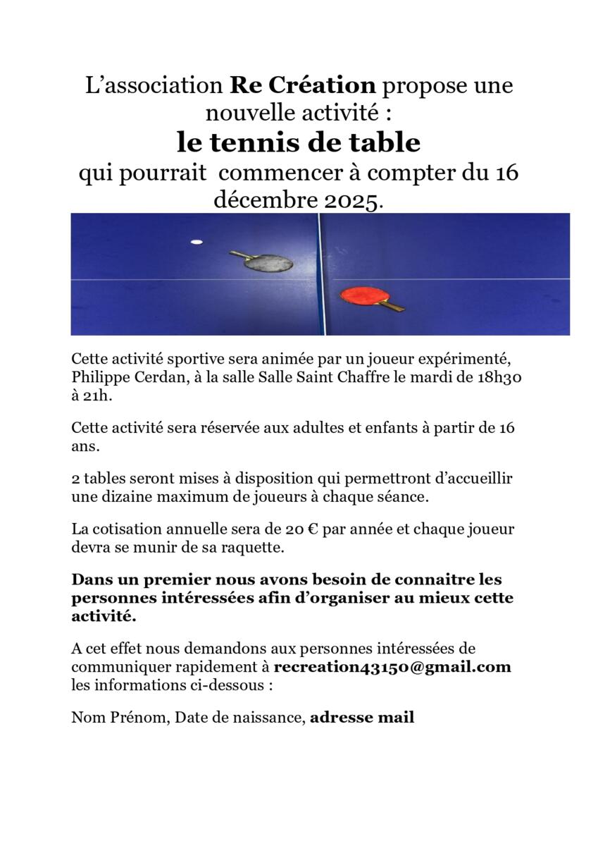 Tennis de table - Recensement des futurs joueurs