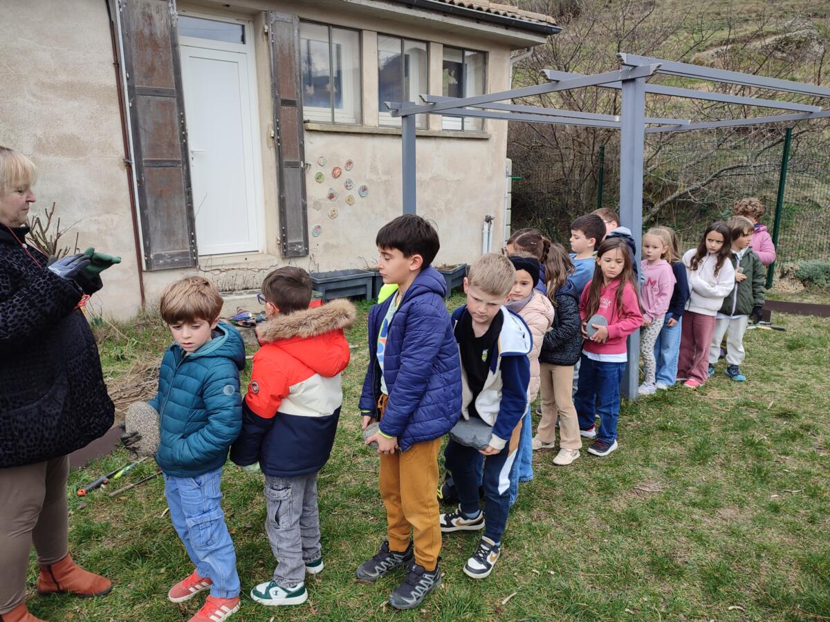 Avec l'aide de l'association ets'aimer43, les élèves de la classe de CP-CE1 ont repris les préparations du jardin de l’école. Munis de gants et d’outils, ils ont commencé par désherber la zone de plantation et enlever les cailloux afin de préparer la terre.