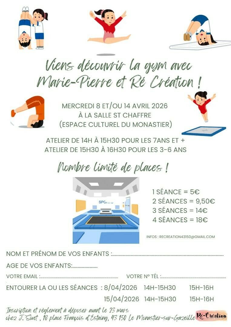 Séances de gymnastique pour enfants - Les 8 et 14 Avril