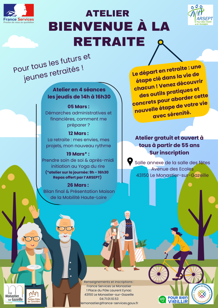 Le départ en retraite est une étape importante dans la vie de chacun. Pour préparer au mieux ce changement, France Services Le Monastier, en collaboration avec l'ARSEPT Auvergne, organise un atelier "Bienvenue à la retraite" pour découvrir des outils pratiques et concrets pour aborder cette nouvelle étape de vie avec sérénité.