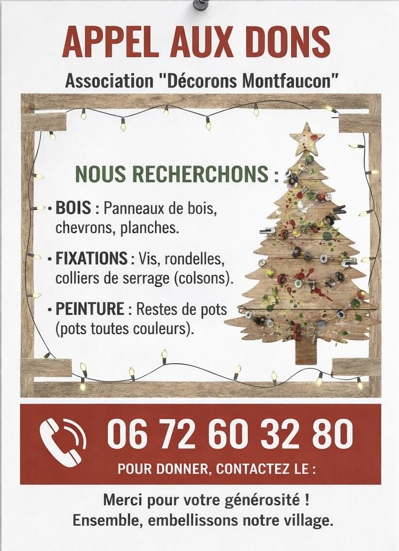 Décorons Montfaucon : Appel aux dons 18/03/2026 Pour donner, contactez le : 06 72 60 32 80 Source : Mairie de Montfaucon-en-Velay