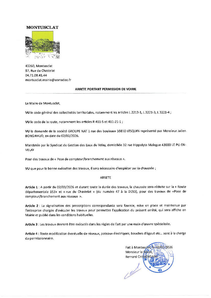 Arrêté de permission de voirie 12/03/2026 Ci-dessous deux arrêtés de permissions de voirie Source : Mairie de Montusclat
