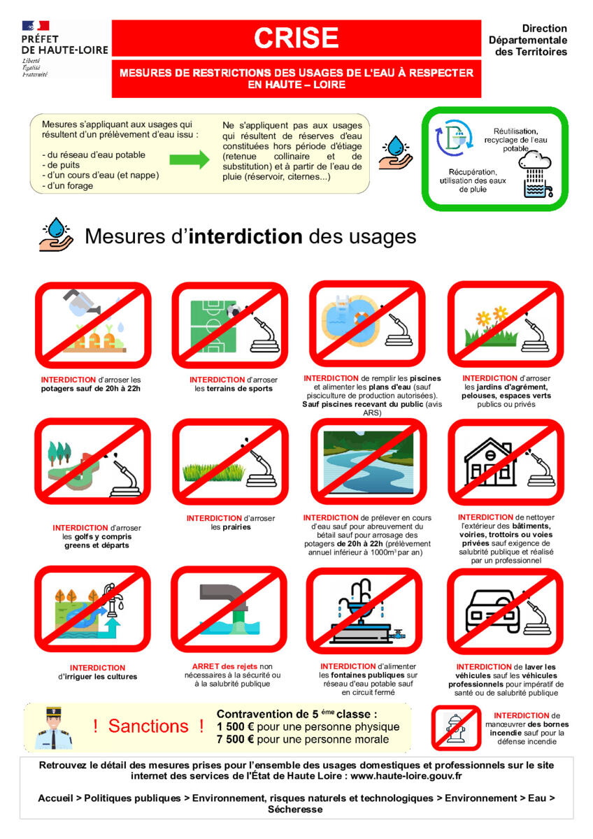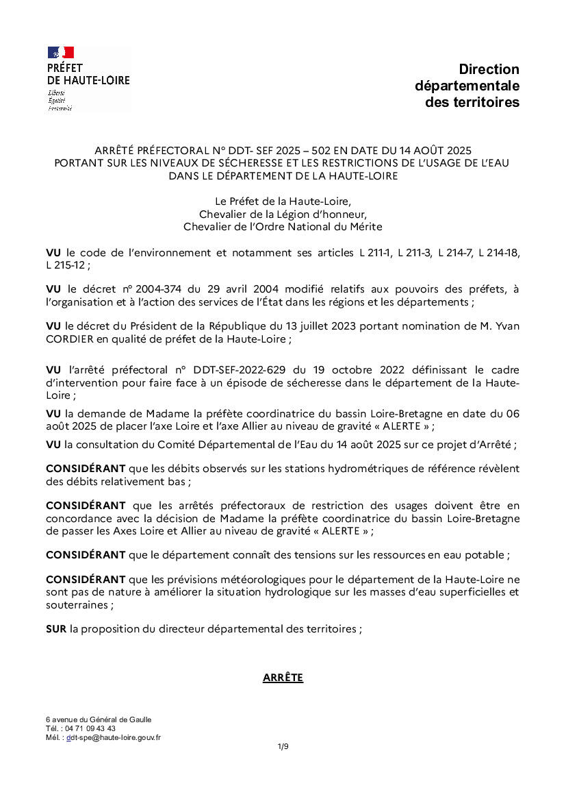 Arrêté sècheresse : département de la Haute-Loire 18/08/2025 Arrêté sècheresse : département de la Haute-Loire en date du 14 aout 2025