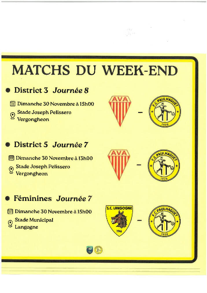 week-end du 29-30 nov 2025 au FCP 26/11/2025 sam 29/11/25 : plateau U10 U11 à Fontannes dim 30/11/25 : Féminines : match à 15h à Langogne district 5 : match à Vergongheon à 13h district 3 : match à Vergongheon à 15h