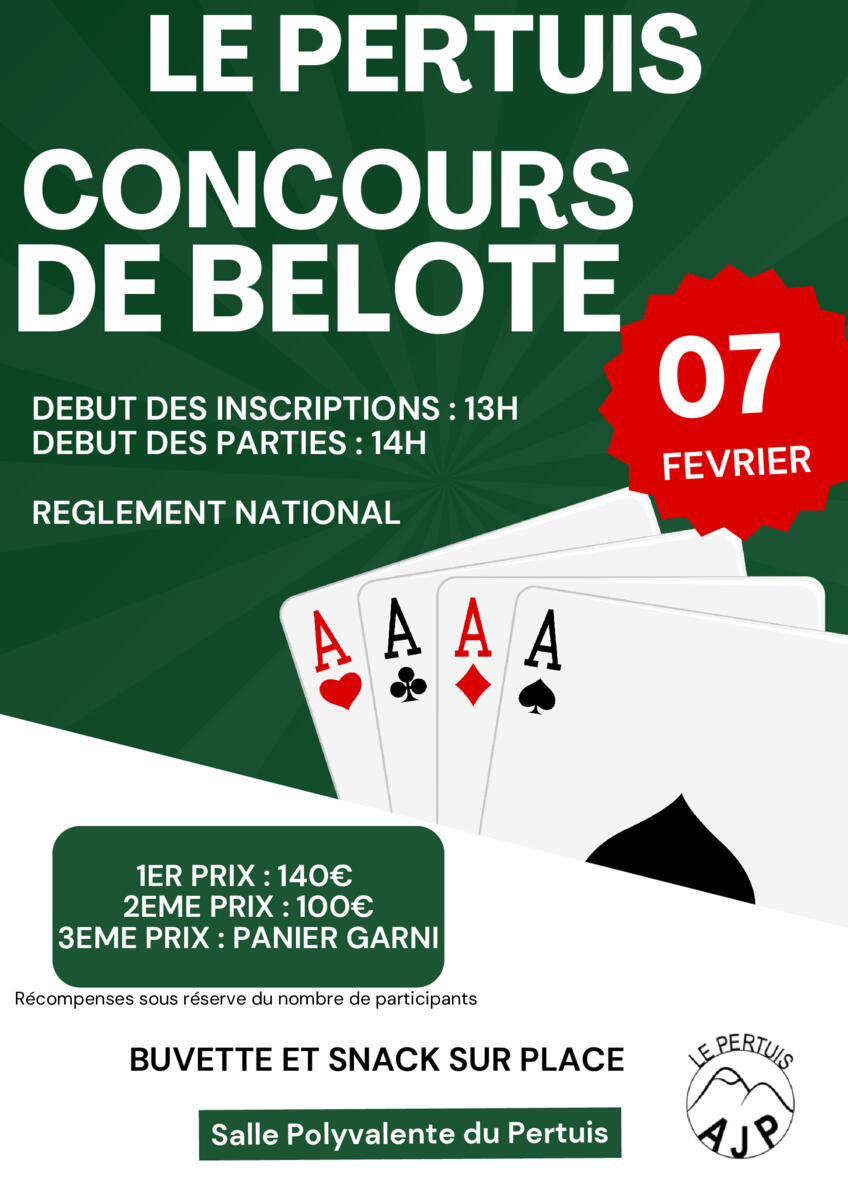 L'Association des Jeunes du Pertuis organise un concours de belote samedi 07 février à La Salle Polyvalente