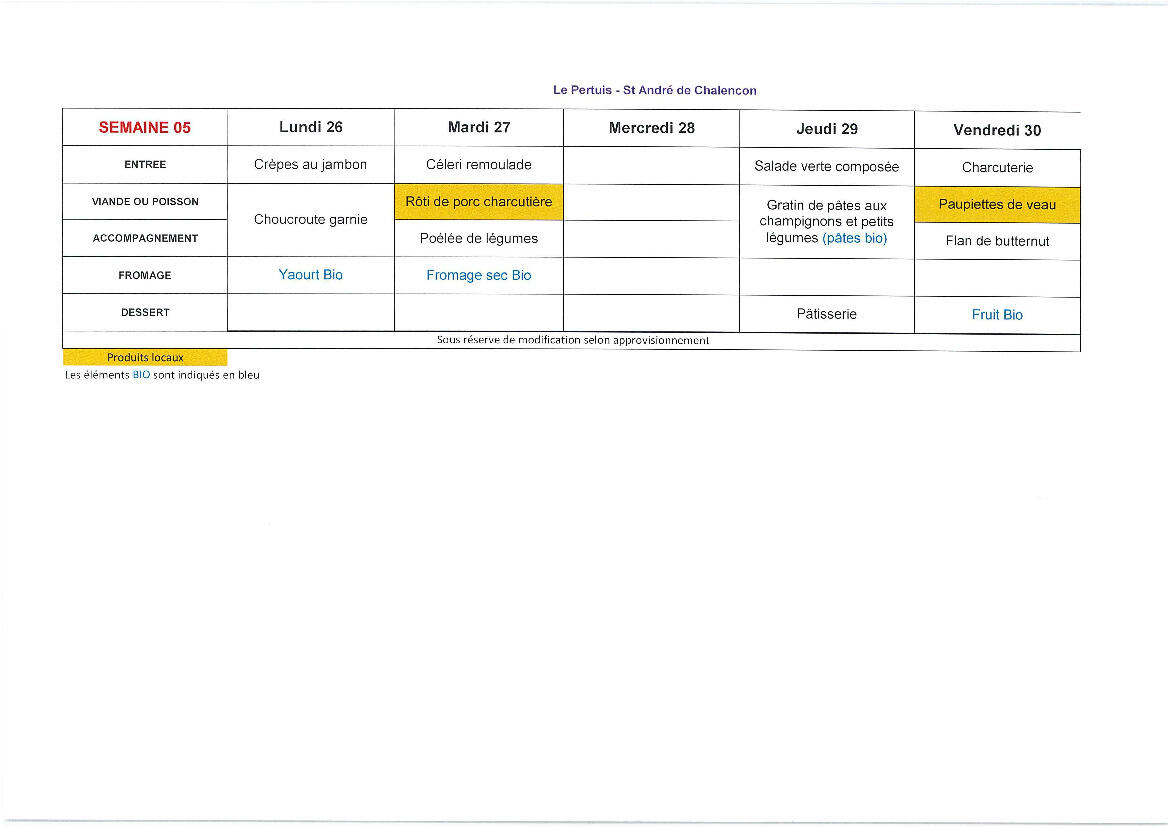 Voici le menu de la cantine du 26 au 30/01