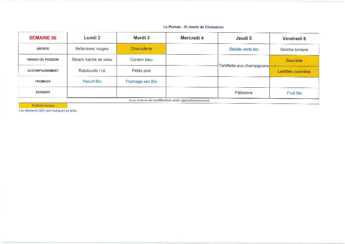 Voici le menu de la cantine du 02 au 06 février