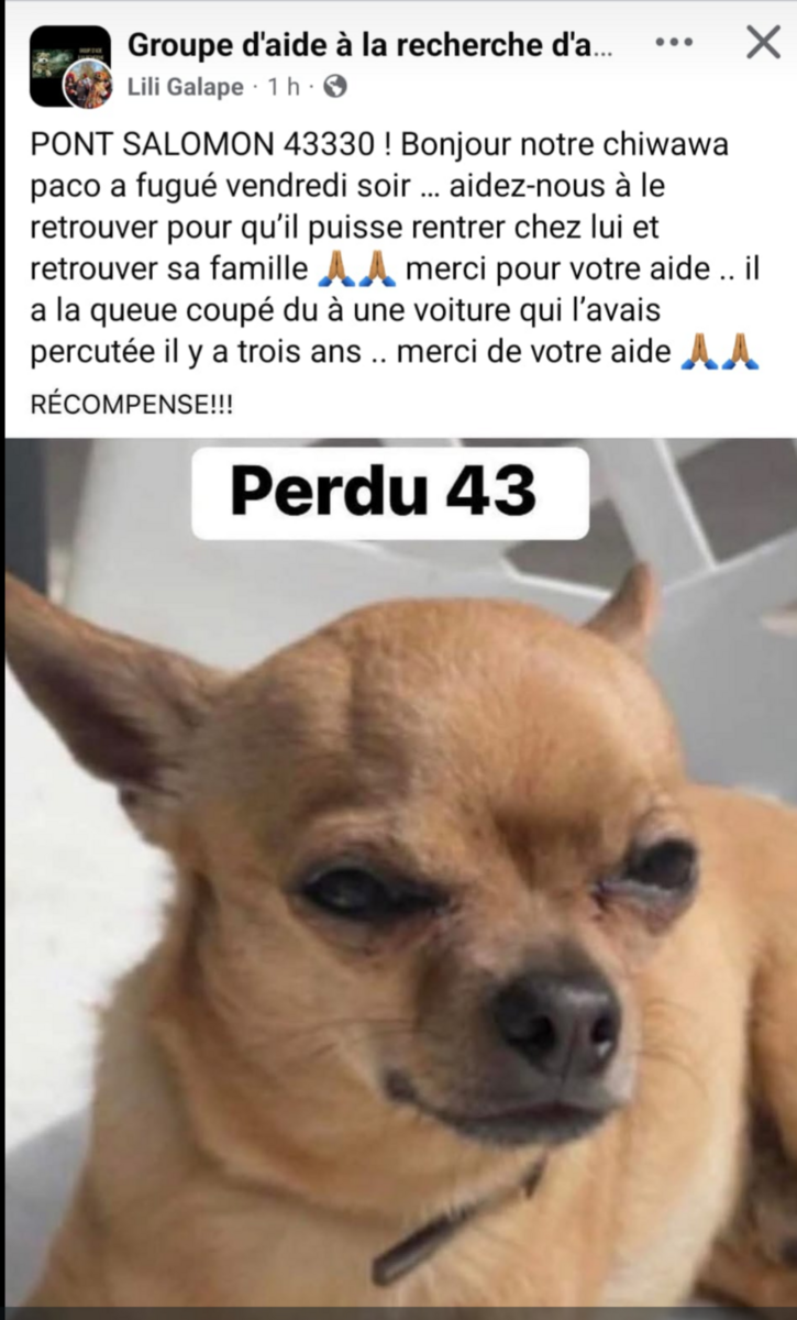 Perdu Petit Chien 17/12/2025 Un petit chihuahua a disparu à Pont Salomon. Si vous avez des informations merci de contacter la mairie