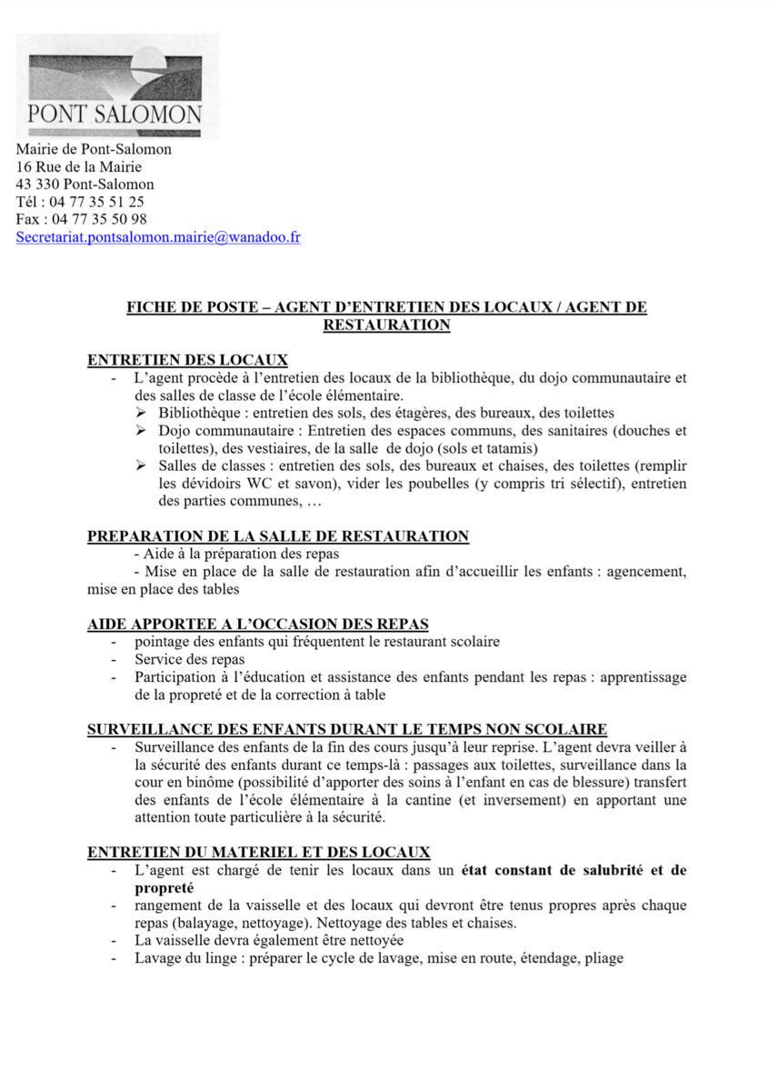 La commune propose un poste au sein de la collectivité : agent d'entretien des locaux et de restauration.