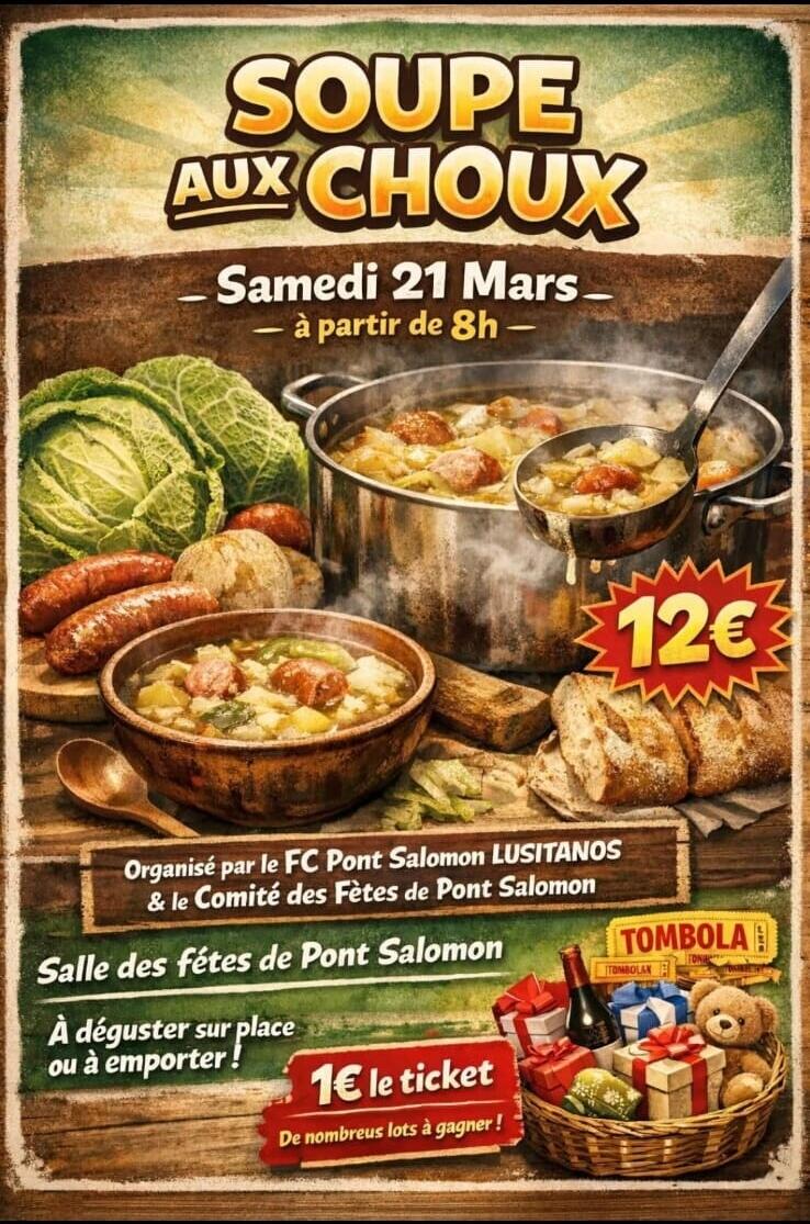 Le FC Lusitanos et le comité des fêtes de Pont Salomon vous convient à leur soupe aux choux samedi 21 mars à partir de 8h00 à la Maison pour Tous