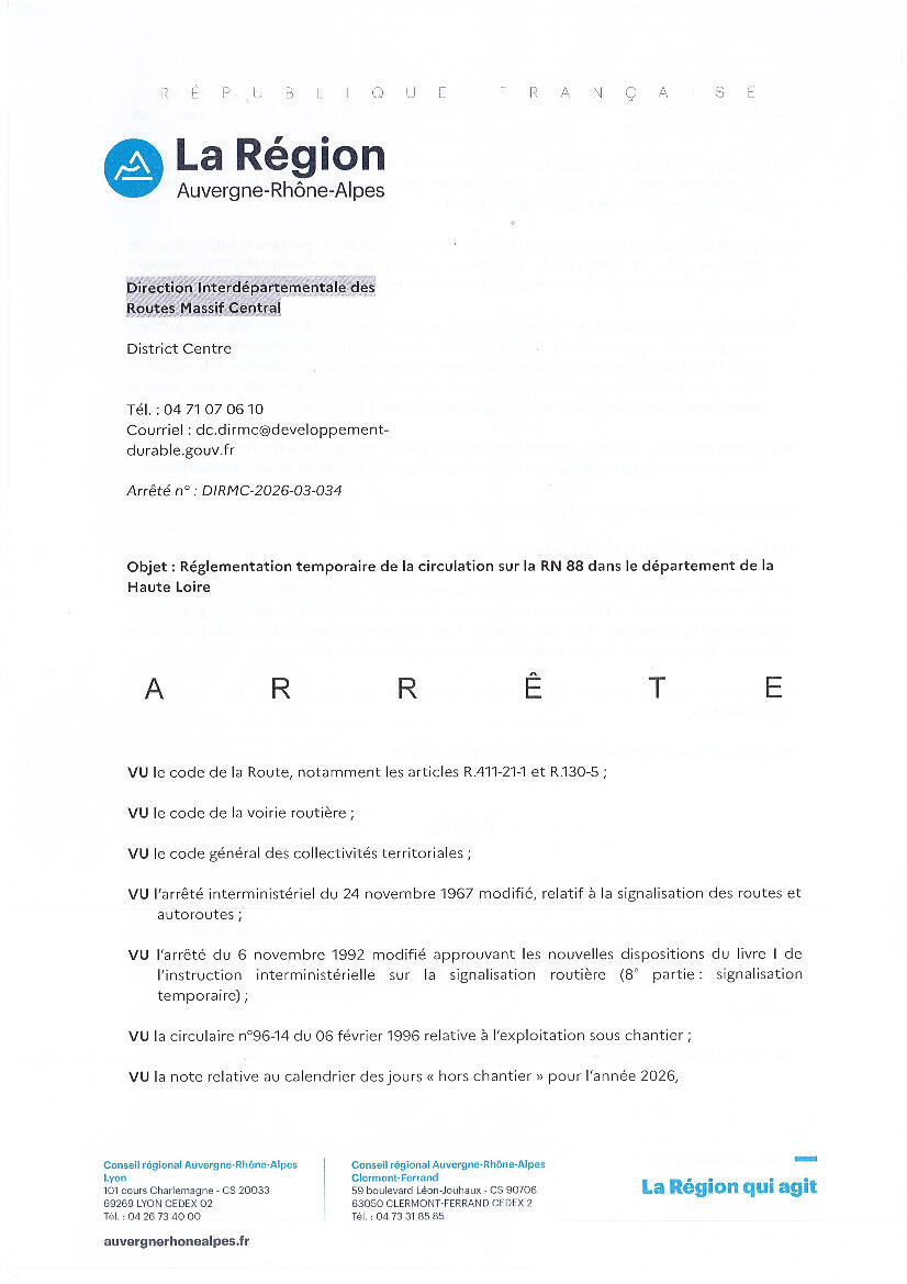 Règlementation Temporaire de la circulation RN 88 Haute-Loir