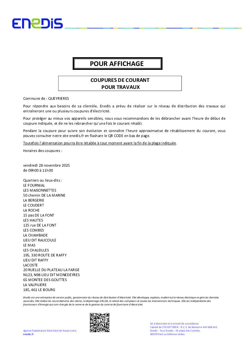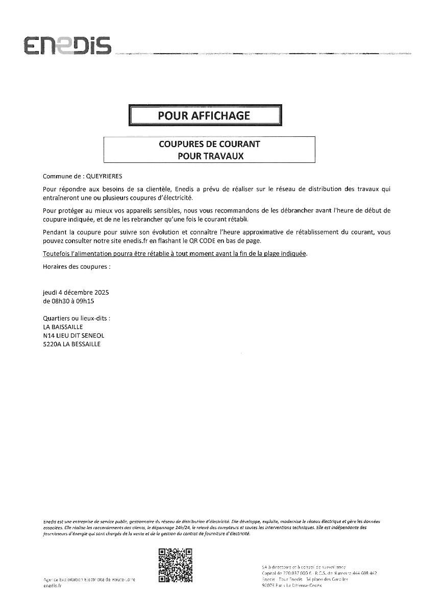ENEDIS-COUPURE DE COURANT POUR TRAVAUX
