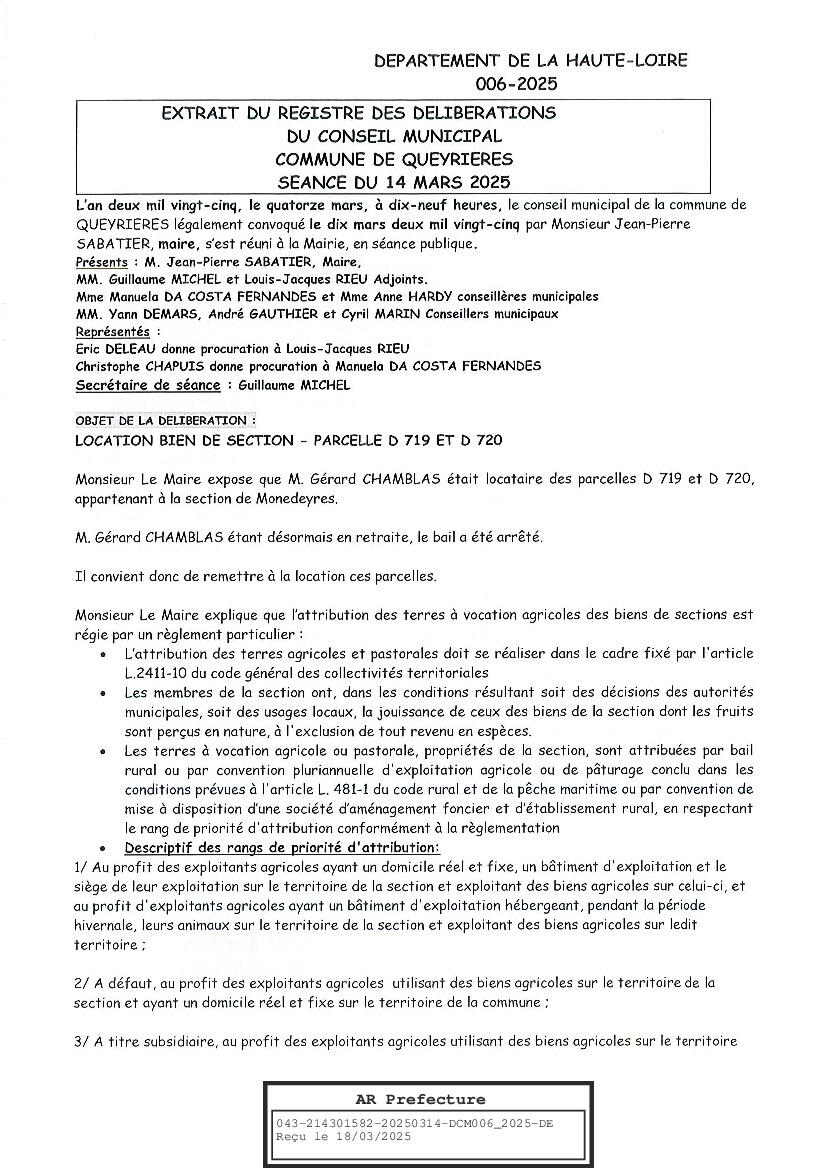 Le conseil municipal de Queyrières a délibéré vendredi 14 mars 2025 pour mettre en location les parcelles D 719 et D 720, situé à Raffy.
