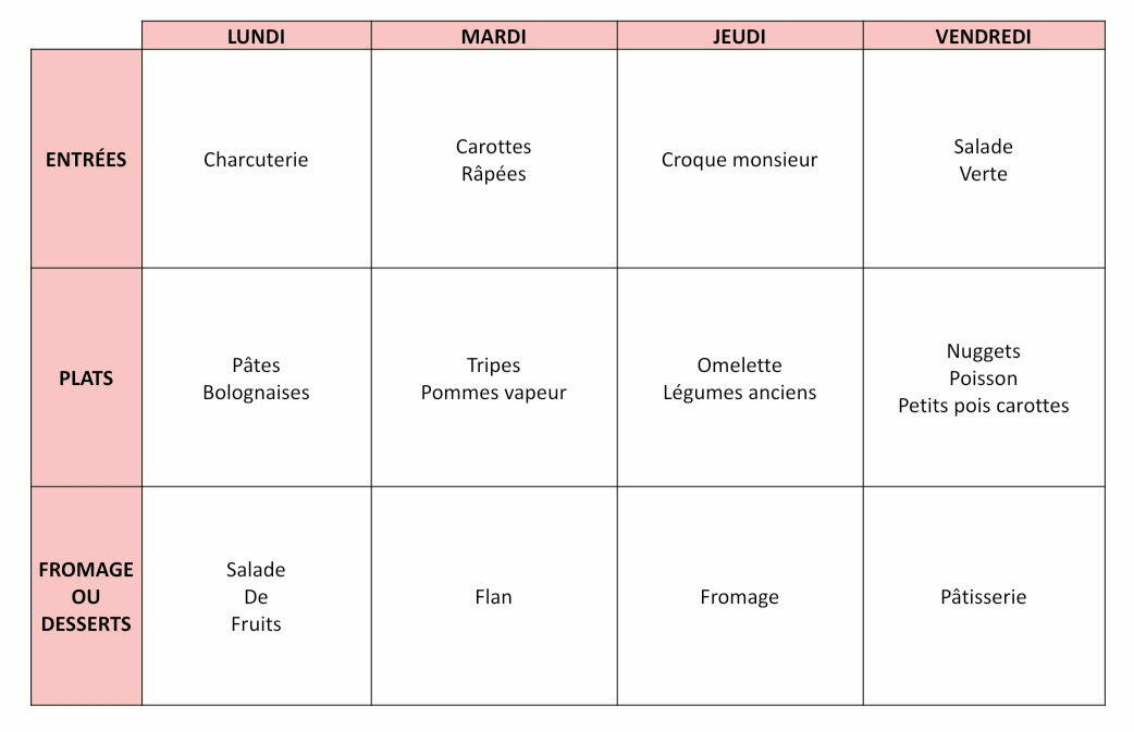 Voici le menu de cette semaine :