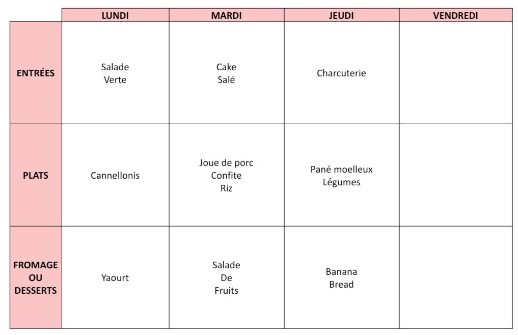 Ci-dessous le menu de cette semaine :