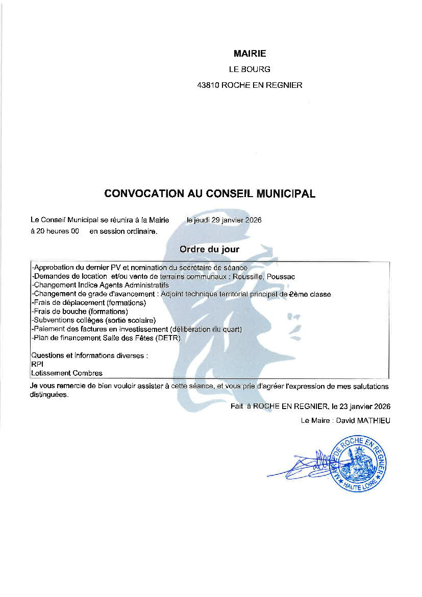 Prochain Conseil Municipal : Jeudi 29 Janvier 2026 À 20H
